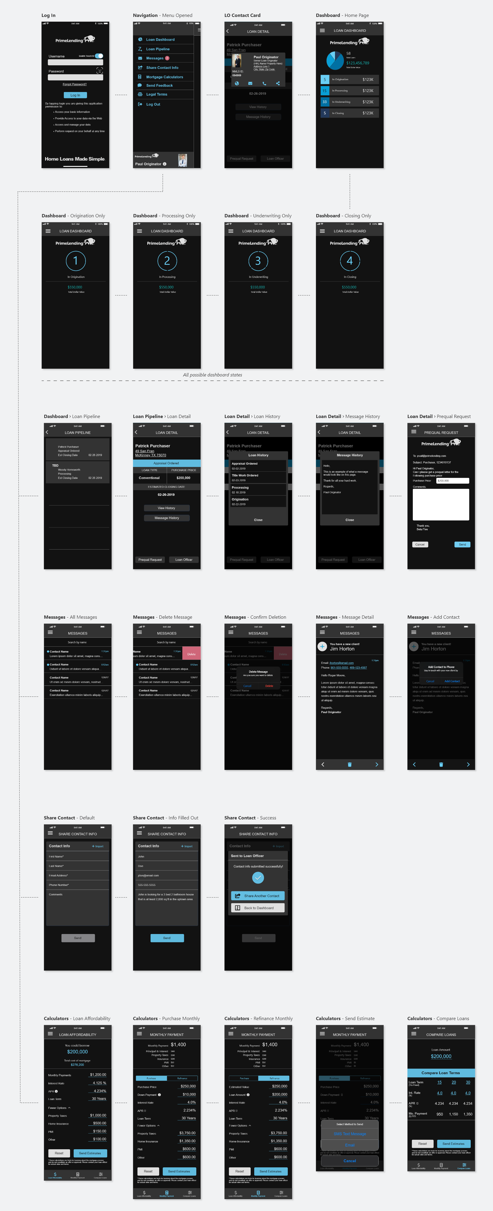 Additional User Goals: Keep in contact with loan officer, quickly share lead information, and use mortgage calculator tools to share reports with clients
